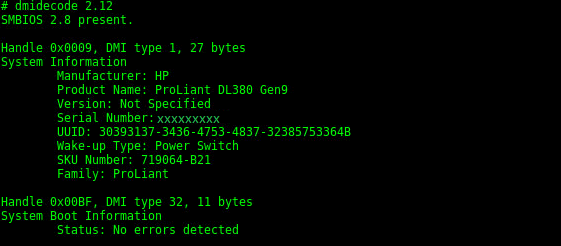 # dmidecode -s system-serial-number GB8114HRCS # dmidecode -t system # dmidecode 2.11 SMBIOS 2.6 present. Handle 0x0100, DMI type 1, 27 bytes System Information Manufacturer: HP Product Name: ProLiant DL580 G7 Version: Not Specified Serial Number: GB8114HRCS UUID: 38383835-3735-4247-3831-313448524353 Wake-up Type: Power Switch SKU Number: 588857-B21 Family: ProLiant Handle 0x2000, DMI type 32, 11 bytes System Boot Information Status: No errors detected